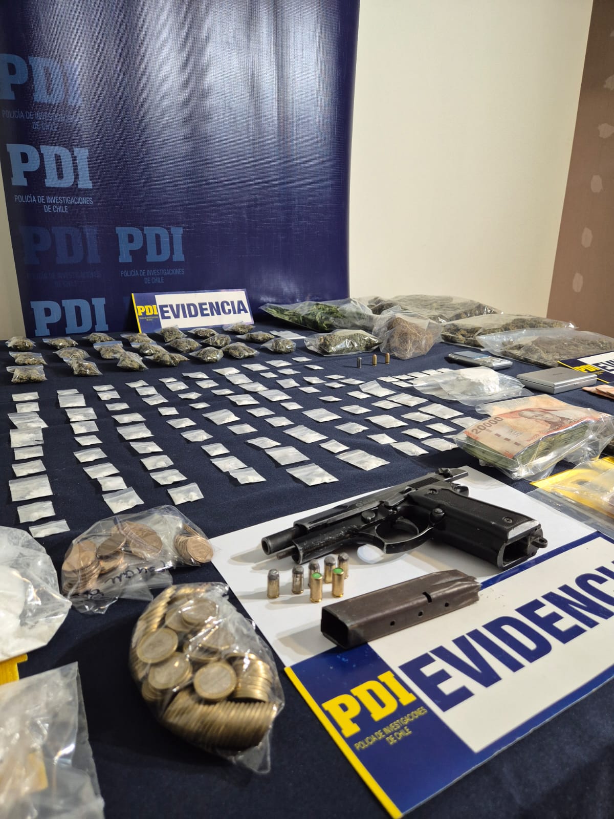 Como parte de las diligencias, la PDI también decomisó diversas especies utilizadas para la dosificación de las drogas, más de un millón de pesos en efectivo, un arma a fogueo apta para el disparo y munición de distintos calibres.