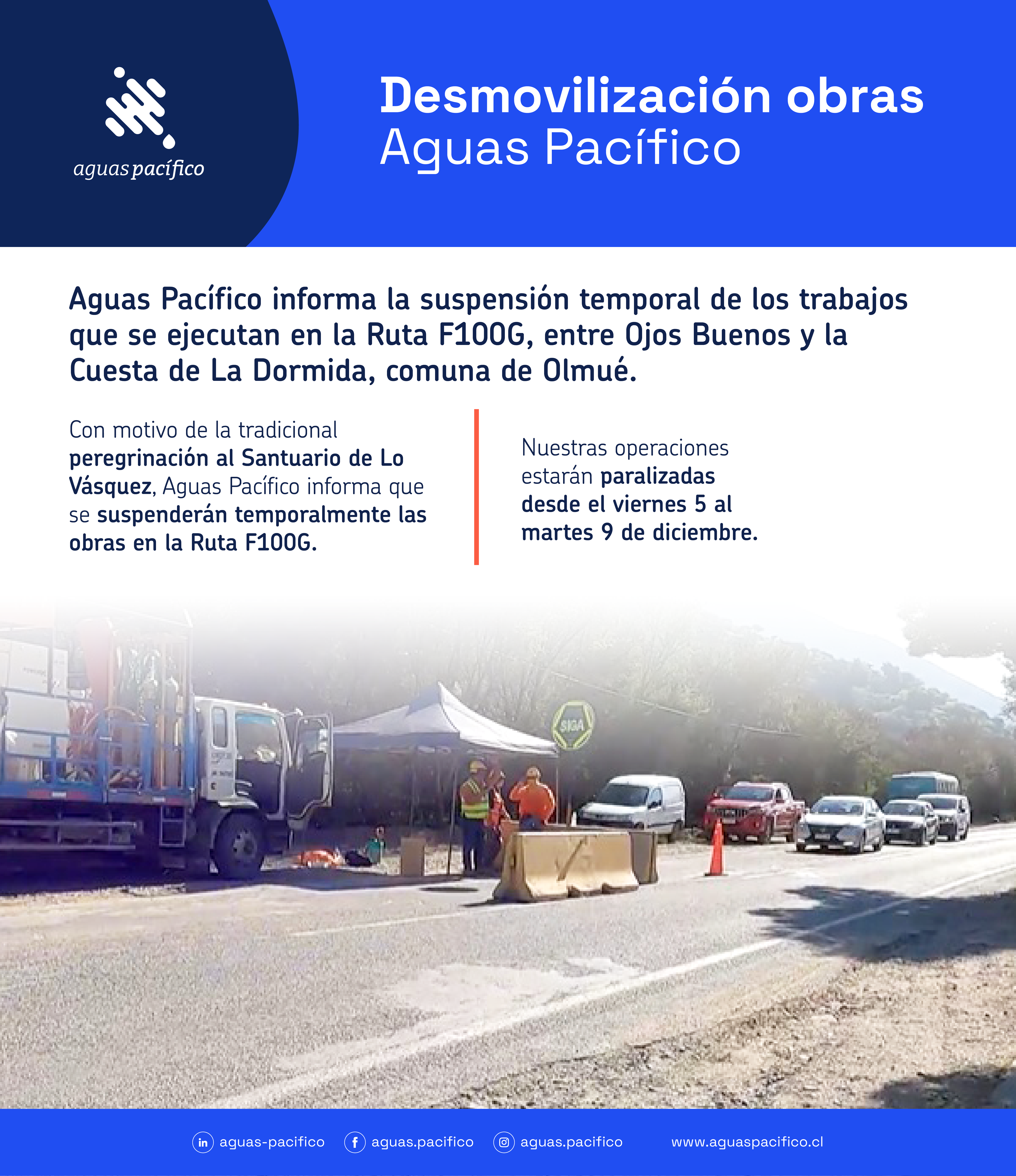 ACTUALIDAD.- A partir de este viernes 5 de diciembre,Aguas Pacífico concretará la desmovilización temporal de sus frentes de trabajo en la Ruta F100G —donde actualmente construye su acueducto—, específicamente en el tramo ubicado entre Ojos Buenos y la Cuesta de La Dormida, en la comuna de Olmué.