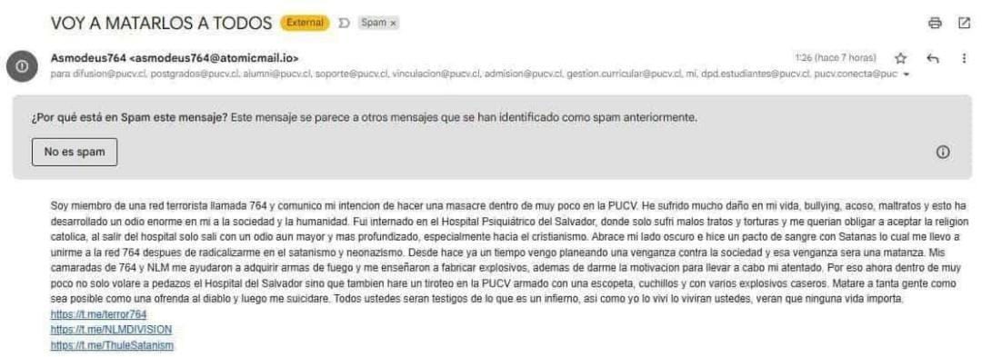 Sin embargo, tras las primeras diligencias y el rastreo de los mensajes, la PUCV determinó que el correo es una copia masiva de textos que han sido enviados a múltiples universidades, no solo a nivel nacional, sino también internacional.