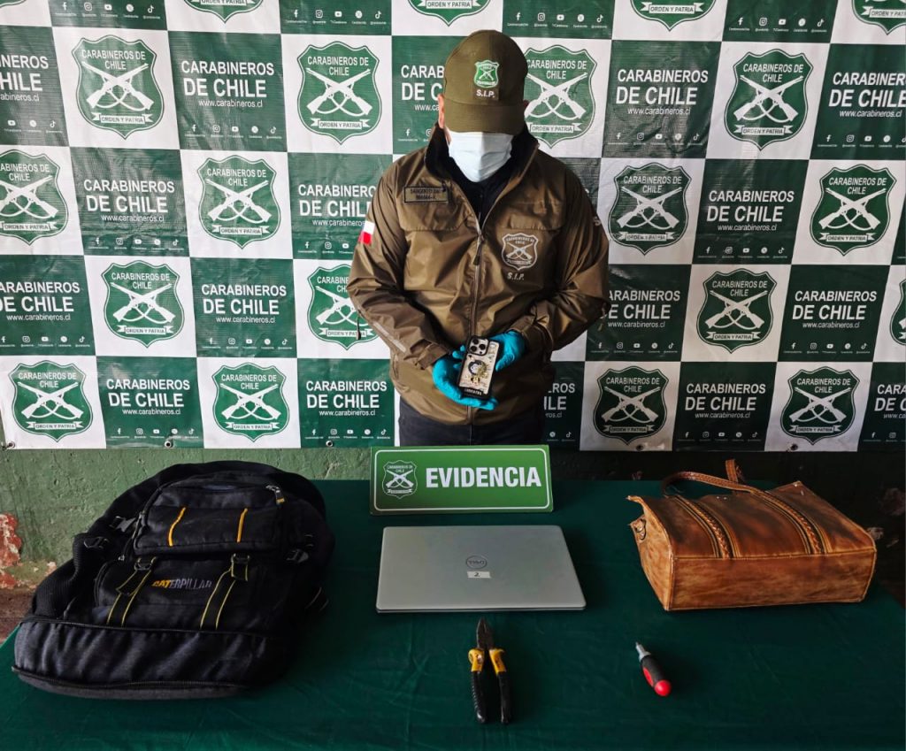 Entre las especies recuperadas desde la mochila que portaba el individuo se encontraban: un computador; un teléfono celular iPhone 14 Pro; una cartera con documentos personales y tarjetas bancarias; dinero en efectivo y un destornillador de punta, elemento asociado a la comisión de delitos.