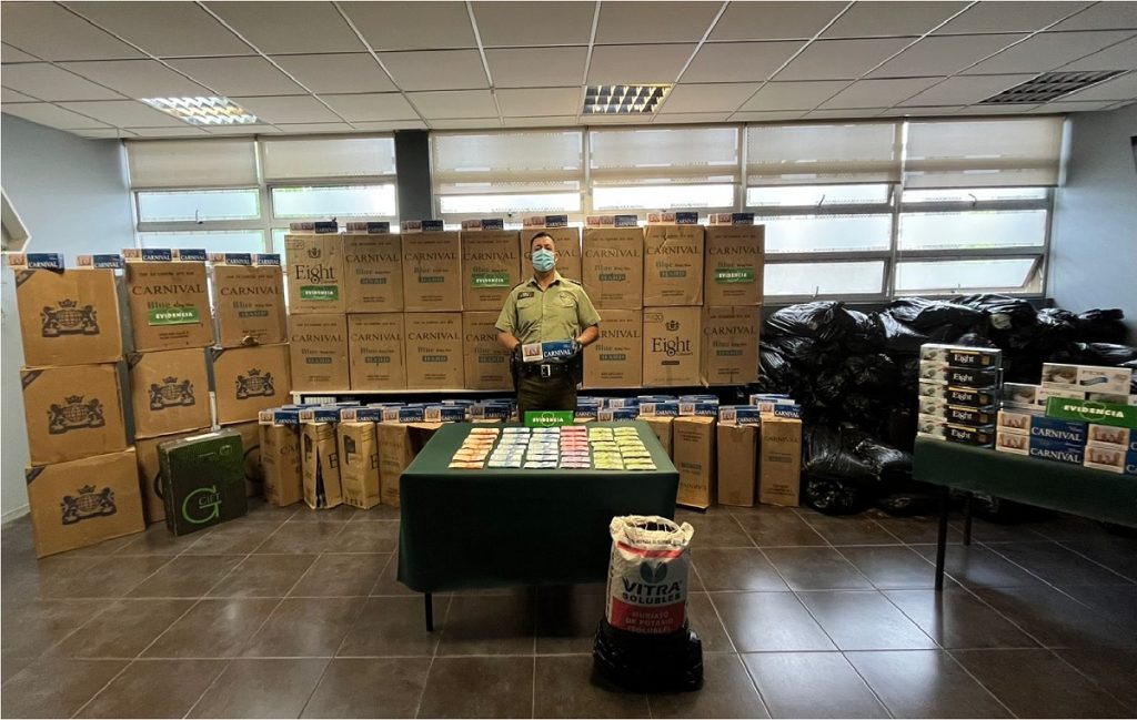 Carabineros develó punto de acopio de cigarros de contrabando, decomisando 19.730 cajetillas de diferentes marcas con un avalúo estimado de $39.460.000 millones.