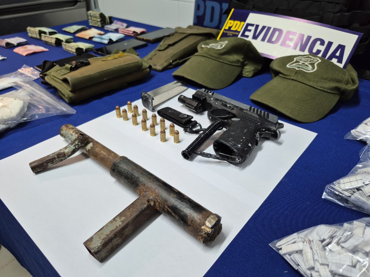 Durante el operativo también se incautaron un arma a fogueo adaptada para el disparo con mira láser, una escopeta de fabricación artesanal, 13 cartuchos calibre .380, dos jockeys con insignias policiales falsificadas, fundas de pistola y un chaleco táctico, los cuales serán periciados por el Laboratorio de Criminalística Regional Valparaíso.