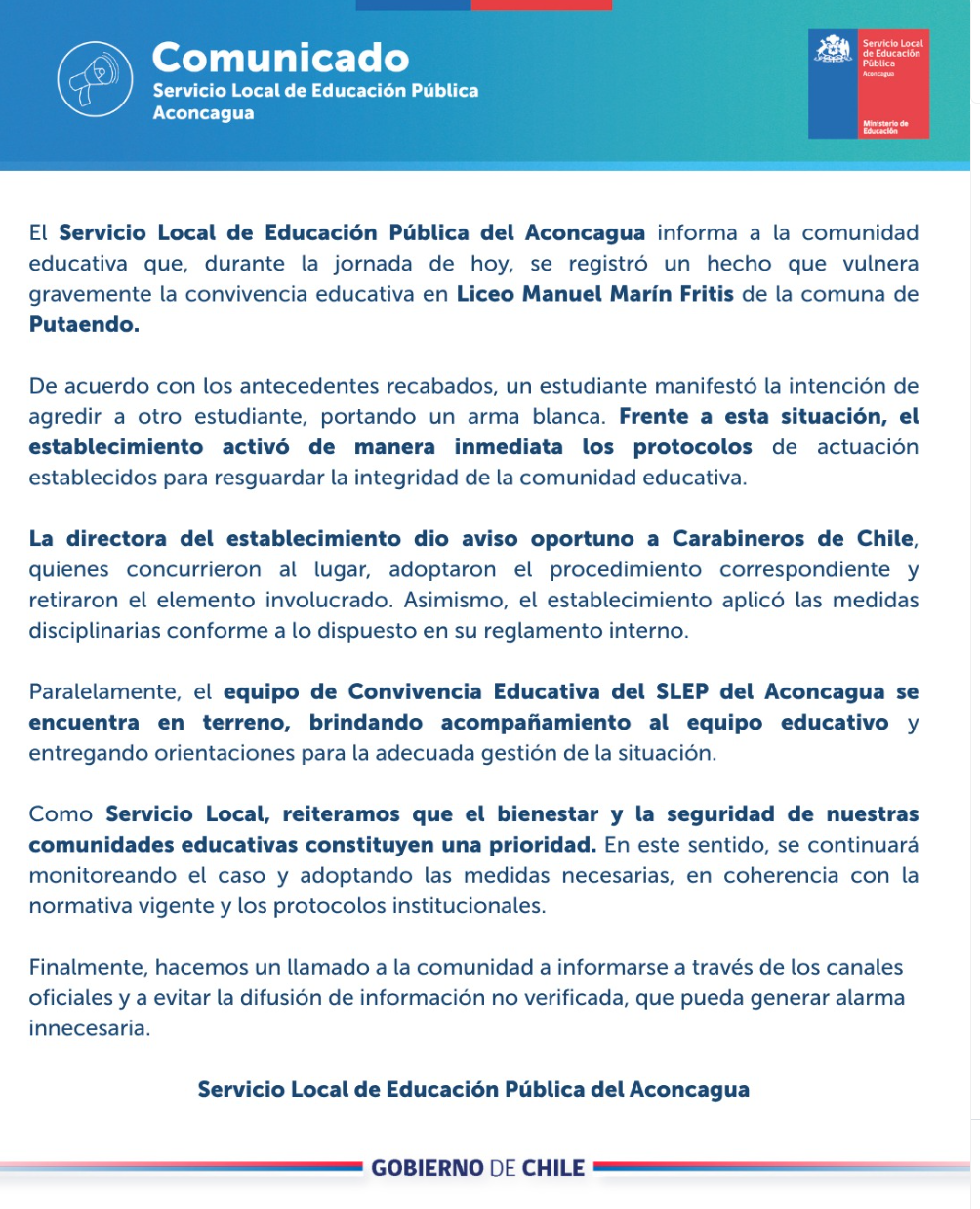 En paralelo, el equipo de Convivencia Educativa del SLEP Aconcagua se trasladó hasta el recinto para acompañar al equipo docente y orientar el manejo de la situación, mientras que desde el establecimiento se aplicaron las medidas disciplinarias correspondientes.