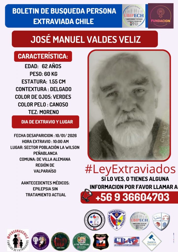 La familia de José Manuel Valdez Veliz, de 62 años, mantiene activa su búsqueda luego de perder contacto con él el pasado 11 de enero en la población Wilson, donde reside y es ampliamente conocido por vecinos del sector.