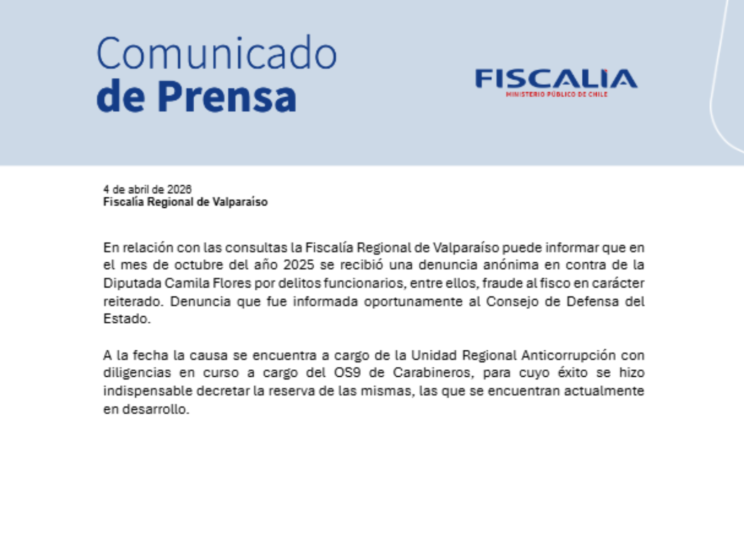 Desde la Fiscalía, en tanto, confirmaron que las diligencias continúan en desarrollo y que, para asegurar su eficacia, se decretó la reserva de la causa. Esto implica que, por ahora, no se entregarán mayores antecedentes sobre el avance de la investigación ni sobre eventuales responsabilidades.