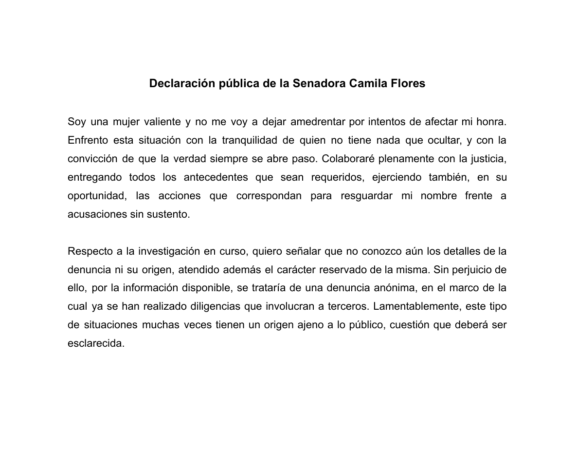 Frente a este escenario, Flores optó por responder públicamente, marcando con claridad su postura. “Soy una mujer valiente y no me voy a dejar amedrentar por intentos de afectar mi honra”, señaló en su declaración, agregando que enfrenta la situación “con la tranquilidad de quien no tiene nada que ocultar y con la convicción de que la verdad prevalecerá”.
