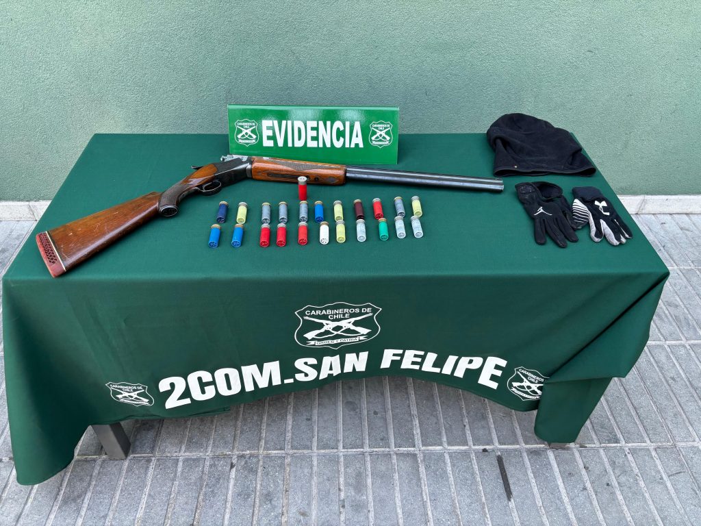 SAN FELIPE. — Carabineros de San Felipe, en el marco de un servicio focalizado en la Villa Departamental, logró la detención de un sujeto conocido por realizar de manera habitual disparos en la vía pública, incautando en el procedimiento una escopeta y una gran cantidad de municiones.