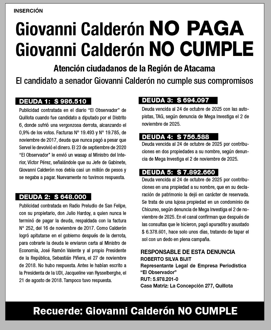 ATACAMA / QUILLOTA. — El candidato a senador por la Región de Atacama, Giovanni Calderón Bassi, quien también fuera ex candidato a diputado por el distrito 6 en el año 2017, enfrenta una grave denuncia pública por el incumplimiento reiterado de obligaciones financieras y deudas de campañas políticas anteriores, así como deudas personales recientes.