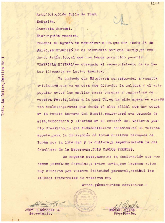 Decidieron entonces, enviar una carta, solicitándole permiso para que el grupo artístico sindical, llevara su nombre. “Tenemos el agrado de comunicar a Usted que se organizó en el Sindicato Enrique Oertly un grupo artístico, al que nos hemos permitido ponerle Gabriel Mistral, en obsequio al reconocimiento a su labor literaria en Latino América”, señala en su parte medular la misiva.