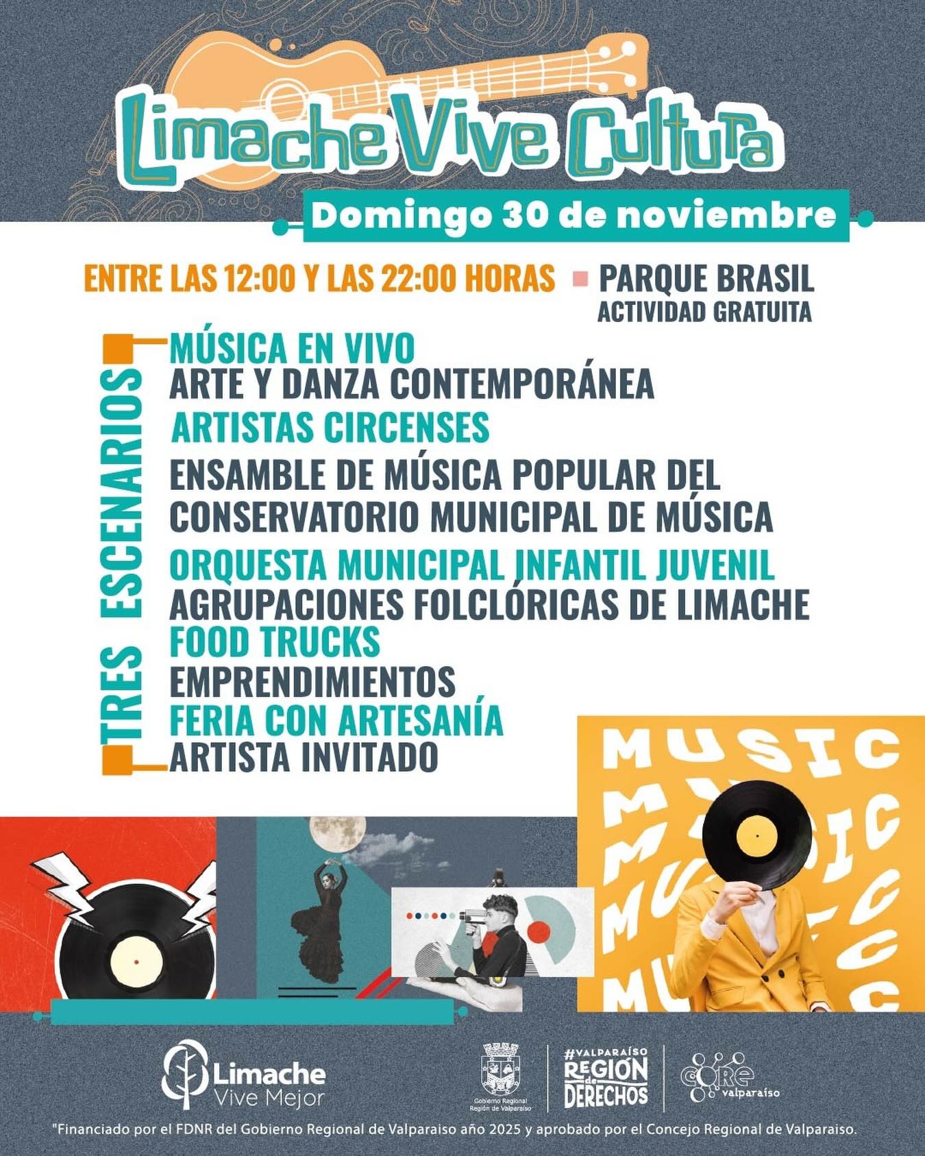 LIMACHE. — El Parque Brasil de Limache se convertirá en el epicentro de la cultura y el encuentro familiar este domingo 29 de diciembre con un evento masivo, gratuito y de jornada completa organizado por la Municipalidad. Desde el mediodía, vecinos de la comuna y de la Región de Valparaíso están invitados a participar en una fiesta que contará con tres escenarios simultáneos, destacando la música, el teatro, la danza, emprendimientos y gastronomía.