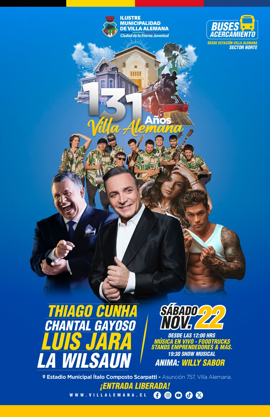 “Hemos preparado con mucho cariño una programación para celebrar juntos este nuevo aniversario de Villa Alemana. Hicimos un gran esfuerzo para traer artistas de nivel internacional como Luis Jara; pero también queremos relevar el gran talento local de bandas como La Wilsaun; traer baile y alegría brasileña con Tiago y Chantal; y la simpatía, carisma y buena onda de un gran comunicador como Willy Sabor, y así ofrecer un espectáculo completo, gratuito y de calidad para todas las familias de la comuna. Los esperamos este sábado 22 de noviembre en el Estadio Ítalo Composto, celebremos juntos los 131 años de Villa Alemana”.