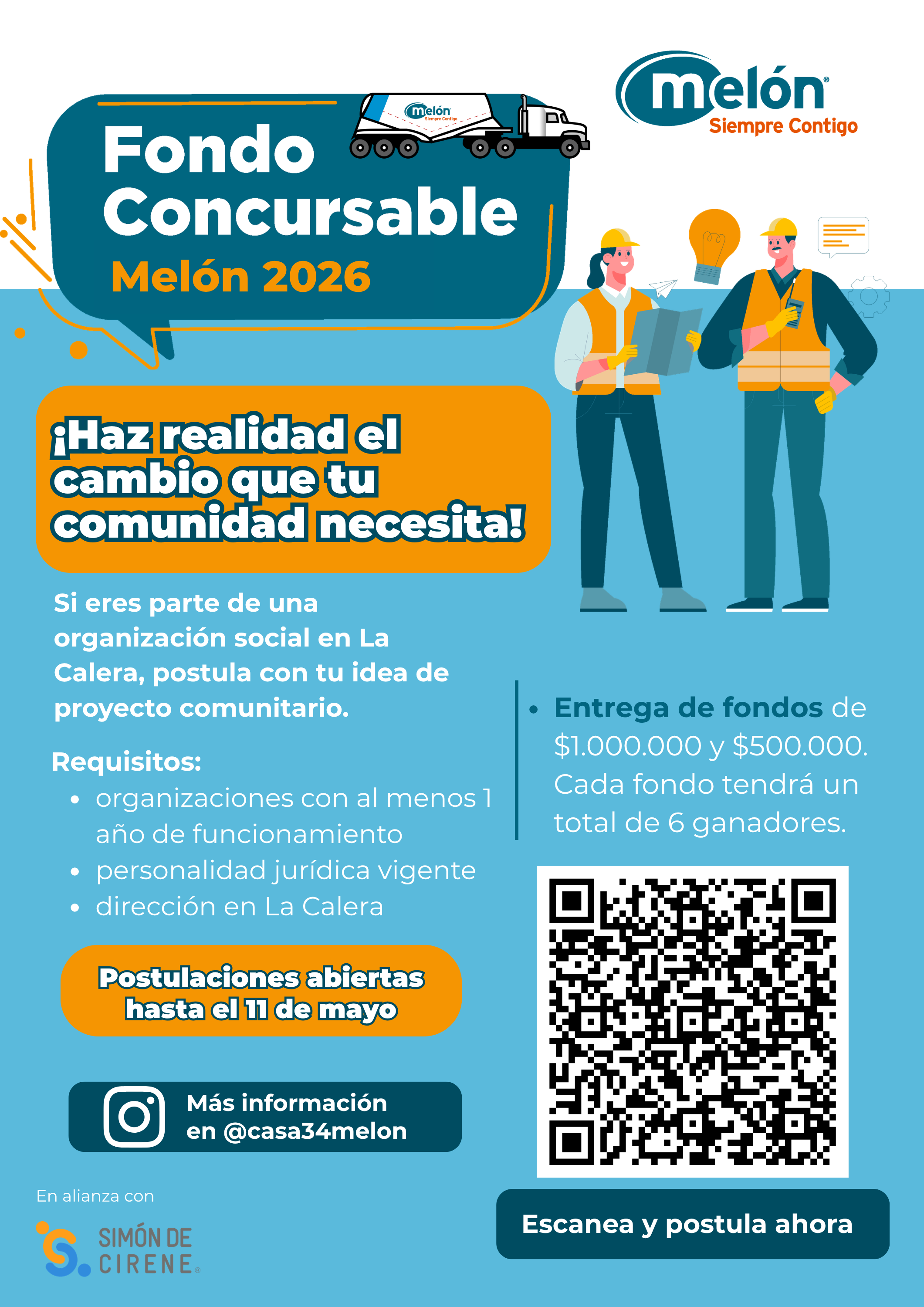 Para acceder al formulario de postulación, te invitamos a escanear el código QR en la imagen de la convocatoria, ingresar al Instagram de @casa34melon o de manera presencial dirigiéndose a Calle Carrera N°1350, en la Casa 34 Melón.