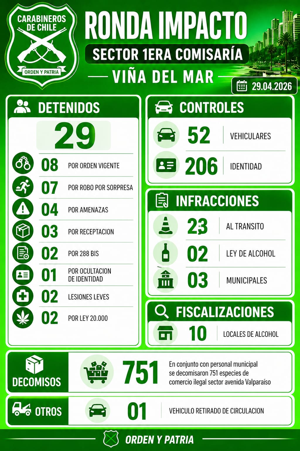 Una nueva Ronda Impacto desarrollada por Carabineros en Viña del Mar dejó como resultado 29 personas detenidas por distintos delitos, en el marco de los despliegues preventivos que se están realizando en la Ciudad Jardín.