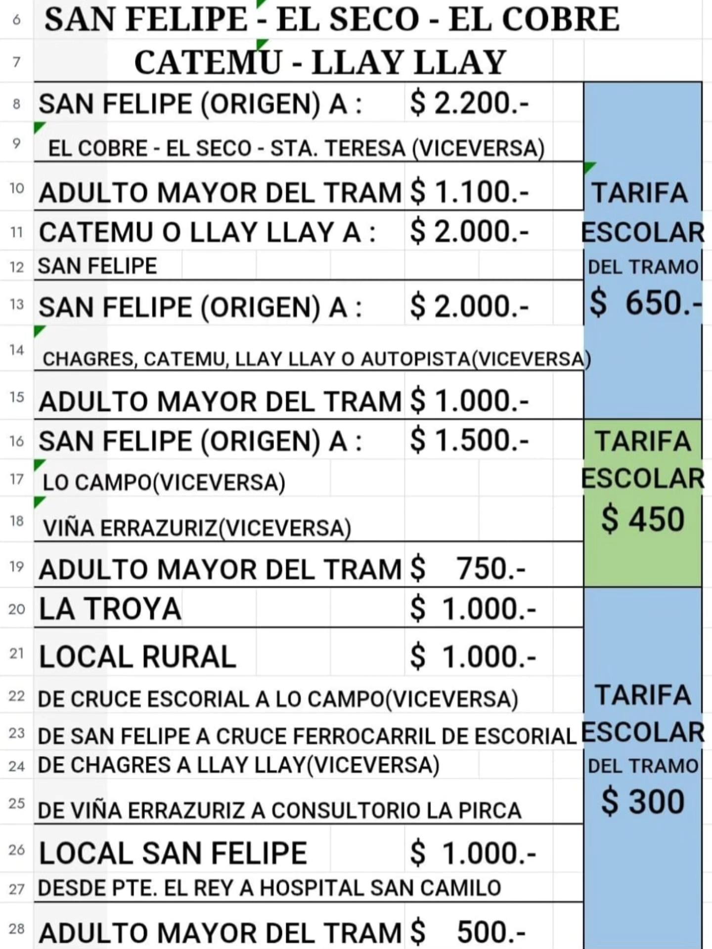 Asimismo, el recorrido Putaendo-San Felipe registró incrementos relevantes, con tarifas que llegan a $2.000 en tramos rurales y $1.500 en servicios directos. A esto se suma ATAXCOA, que anunció nuevos valores en el tramo San Felipe–Los Andes, fijando el pasaje en $1.600 para el recorrido directo.