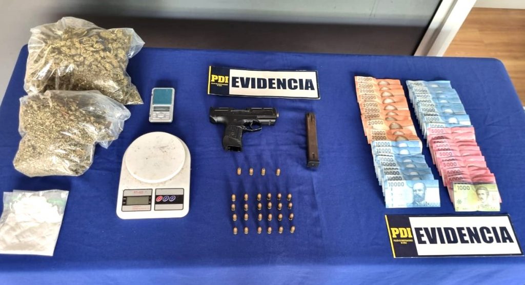 Durante el operativo, la PDI incautó cerca de un kilo de ketamina, droga avaluada en aproximadamente seis millones de pesos, además de una pistola, cartuchos balísticos, balanzas digitales, teléfonos celulares y dinero en efectivo, elementos asociados al delito de tráfico de drogas.
