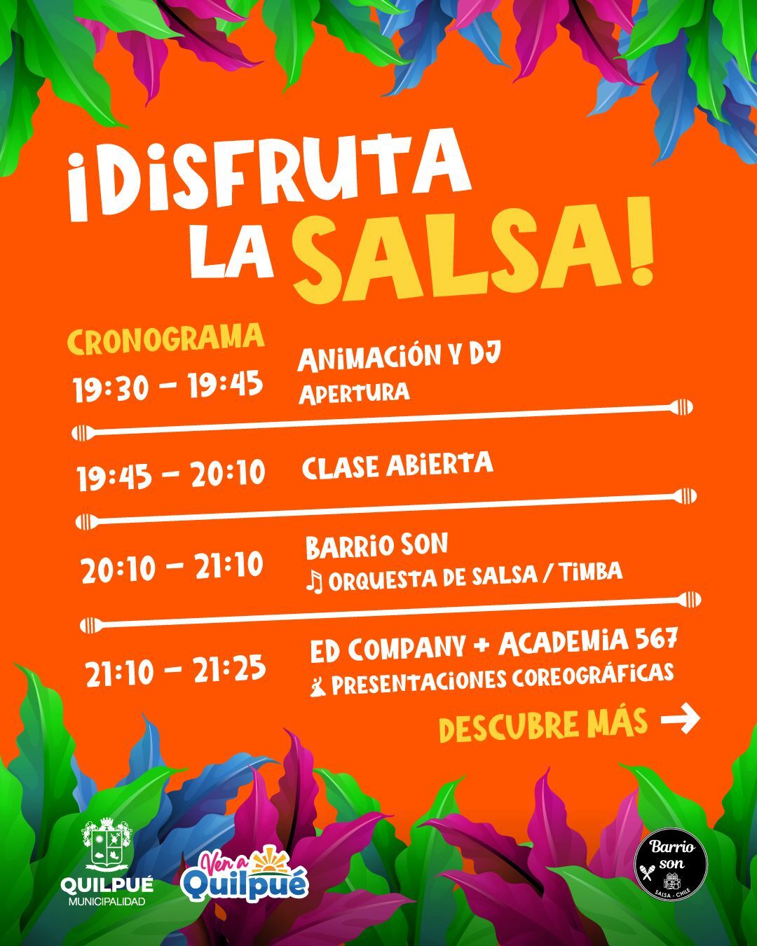 QUILPUÉ.- Con entrada totalmente liberada y pensada para toda la familia, este sábado 21 de enero, desde las 19:30 horas, la Plaza Eugenio Rengifo será el epicentro del ritmo y la alegría con la realización del Primer Festival de Salsa de Quilpué, una iniciativa que busca llenar de música y movimiento el verano en la comuna.