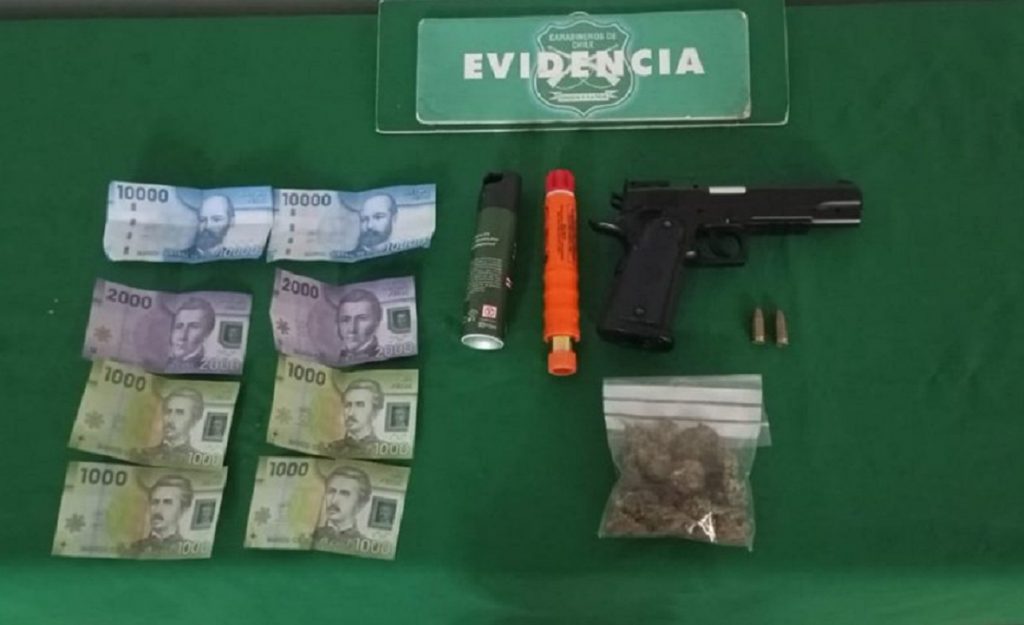 Los efectivos policiales realizaron la fiscalización al automóvil y encontraron una serie de artículos que levantaron sospechas, incluyendo una pistola de aire comprimido, una bengala utilizada habitualmente en situaciones de rescate, y un spray lacrimógeno. Además, se constató la posesión de marihuana al interior del móvil.