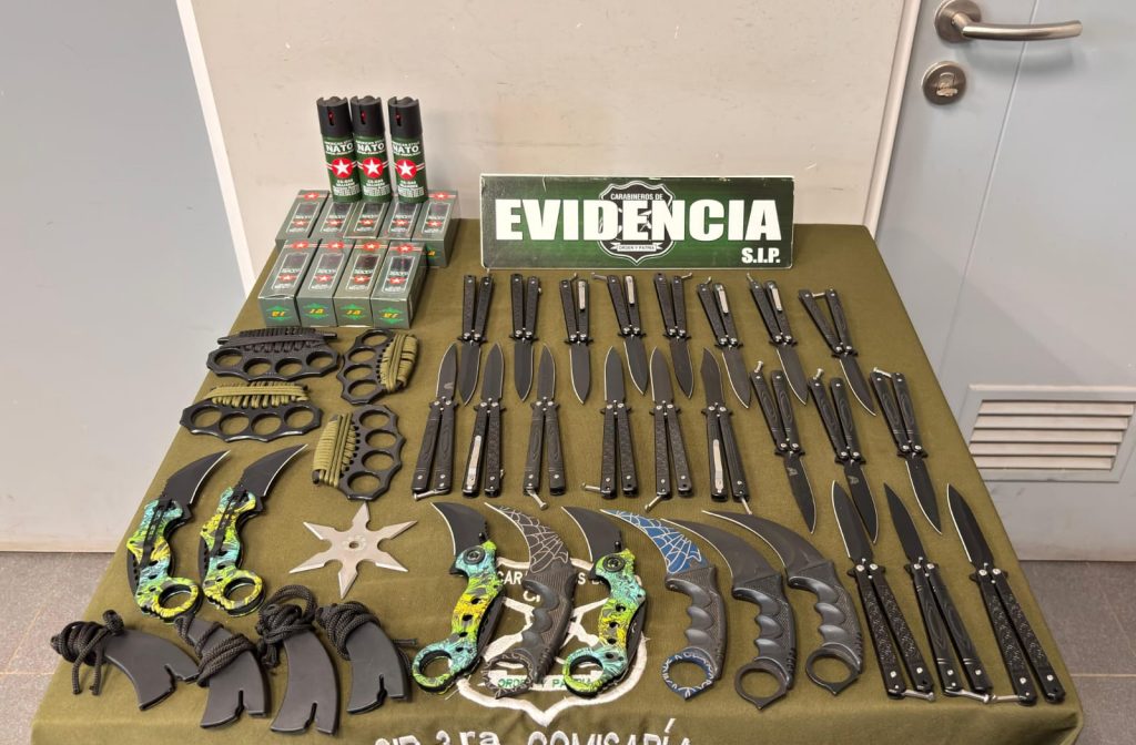 “En el marco del refuerzo de un refuerzo de los servicios preventivos, carabineros sorprende a un hombre en la Feria Navideña del Parque Brasil de la comuna, vendiendo diversas armas cortopunzantes y arrojadizas. Por lo anterior, esta persona fue detenida”, comentó el capitán Fernando Carvallo de la Tercera Comisaría de Limache.