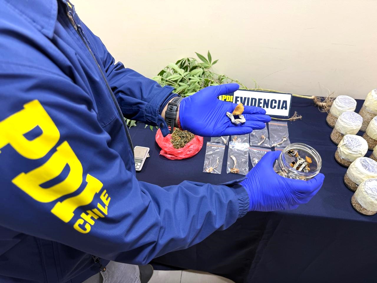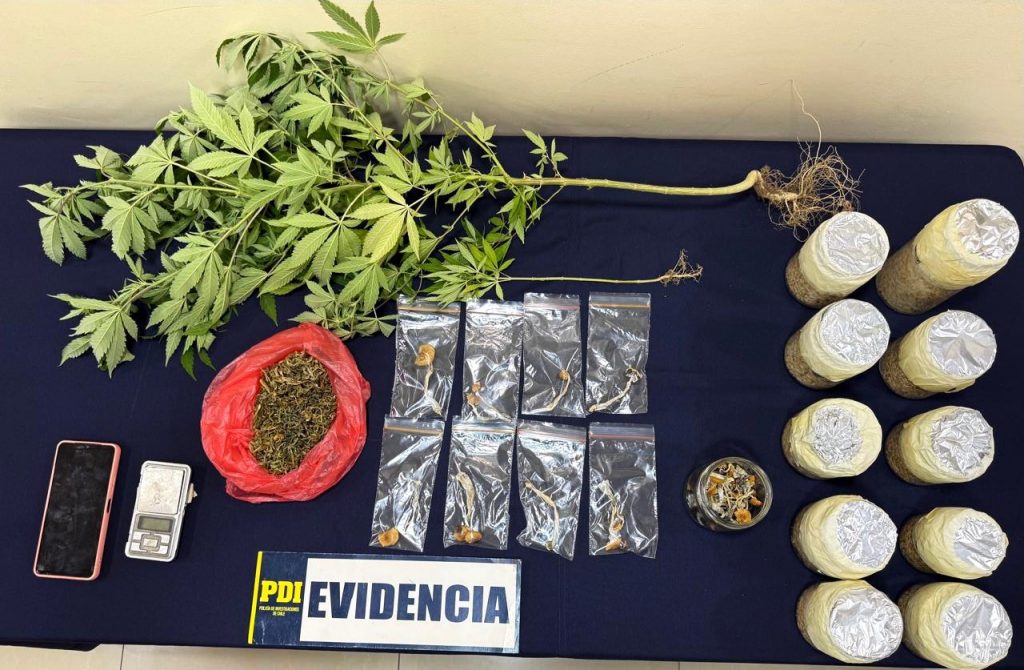 El procedimiento se desarrolló en coordinación con el Ministerio Público, tras una investigación basada en análisis criminal e inteligencia policial que permitió establecer que la imputada se dedicaba al cultivo, cosecha y comercialización de hongos alucinógenos del género Psilocybe, además de cannabis sativa.