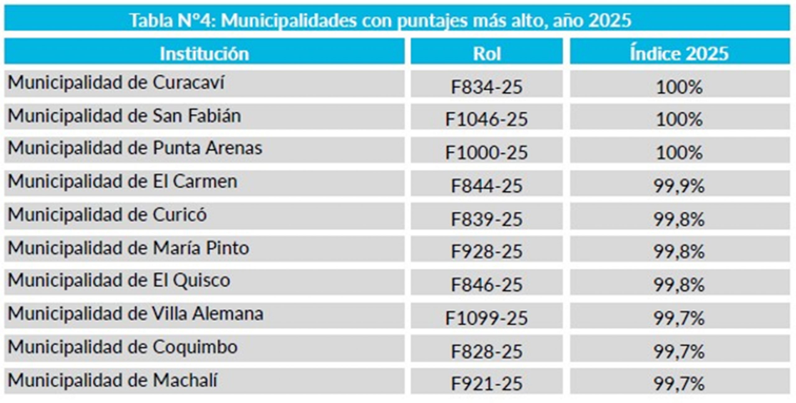 A nivel nacional, el ranking de la fiscalización 2025 es encabezado por Curacaví, San Fabián y Punta Arenas, que comparten el primer lugar con un 100%. Luego aparecen El Carmen (99,97%), Curicó, María Pinto y El Quisco (99,83%,) para cerrar el “top ten” con Villa Alemana (99,78%), Coquimbo y Machalí, ambas con un 99,74% de cumplimiento.
