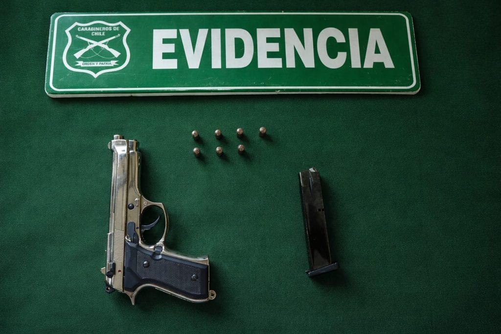 De acuerdo con la información difundida por la institución policial, el sujeto portaba en un bolso una pistola calibre 9 milímetros, la que fue detectada durante el procedimiento policial.